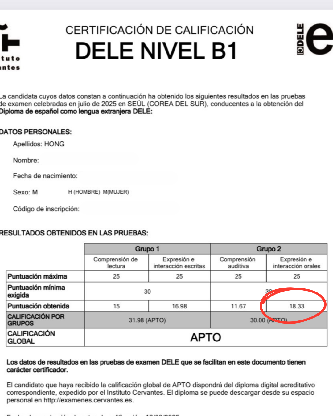 회화 영역에서 19점 가까이 득점해서 총점 30점으로 Apto 받았습니다!